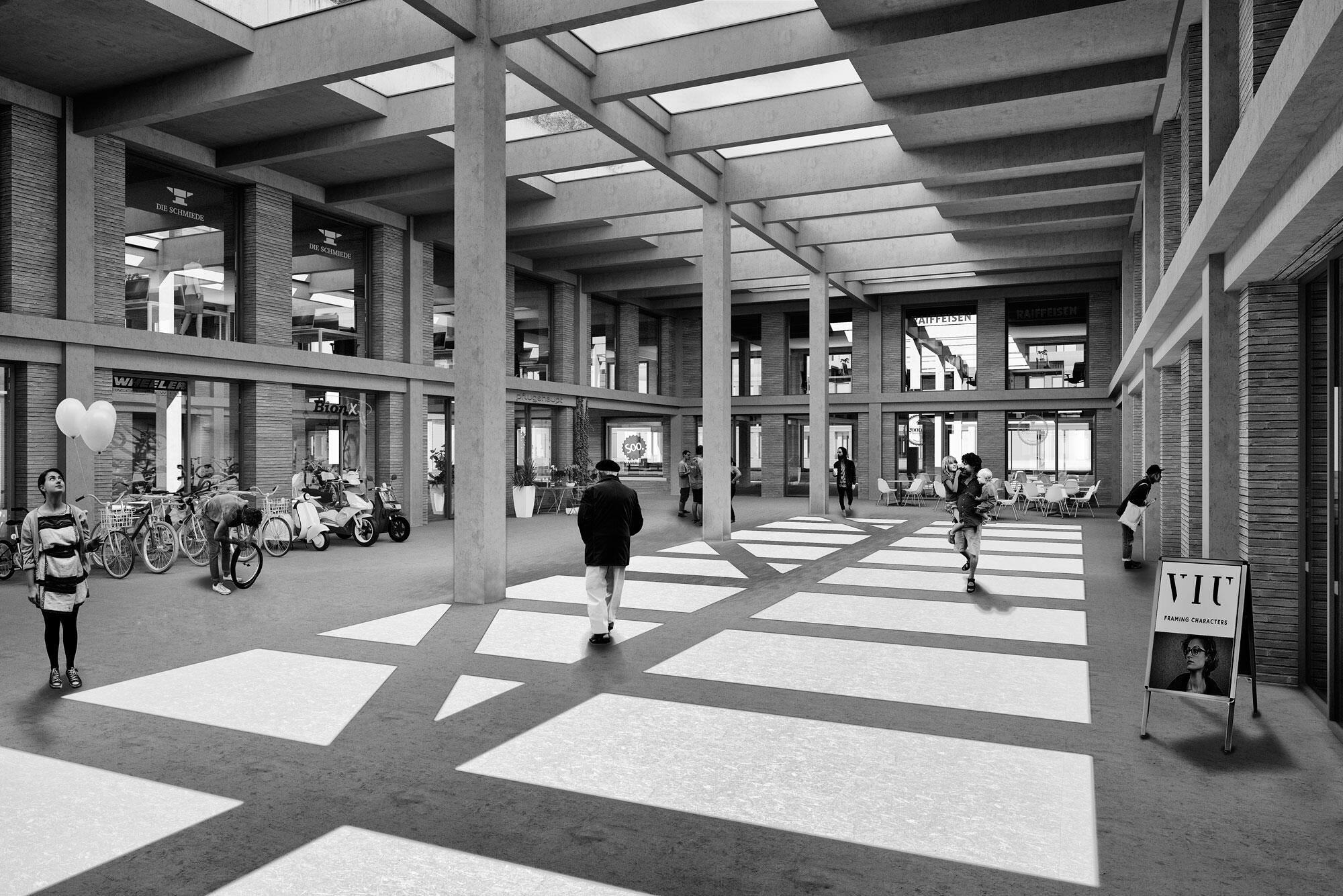 Die neue «Rütistatt» überlagert sich mit der industriellen Prägung des Ortes und dem südlich angrenzenden, gemischten Wohn- und Arbeitsumfeld. Der Fussabdruck der fünf Baukörper zeigt eine grosse Flächenbesetzung, wie es auch im nördlich gelegenen Industriegebiet der Fall ist. In der Dachaufsicht sind vier Winkel und ein Zeilenbau sichtbar. Diese Ambivalenz markiert den Übergang direkt an der ehemaligen Trasseeführung der Sursee-Triengen-Bahn. Auf der Industrieseite flächig fundiert, öffnen die Winkel südorientiert zum Bahnhof. Der fünfte Zeilenbaukörper führt die Staffelung entlang der Industriestrasse fort. Diese Staffelung ist auch in der Vertikalen wichtig und akzentuiert mit einer Hochhausscheibe den Abschluss des Bahnhofgebietes. Entlang der Zeughausstrasse markiert ein fünfgeschossiger Winkel die notwendige Präsenz. Gleichzeitig werden damit die angrenzenden Flächen als durchgängiger ‚Stadtteppich‘ lesbar und schaffen Adressen. Entlang der Industriestrasse öffnen Freiräume mit Südorientierung die «Rütistatt» Richtung Bahnhof. Begleitend zur Zeughausstrasse wirkt künftig ein gut besonnter Platz mit Westausrichtung adressbildend. Dieser Freiraum schafft einen Zwischenraum für das Weiterbauen im Chlifeld. Städtebaulich vermittelt das Chlifeld zwischen den beiden Entwicklungsschwerpunkten «Rütistatt» und Zeughaus in seiner vertrauten Massstäblichkeit. Dem vielfältigen Nutzungsprogramm begegnet der Entwurf mit einer durchgängigen Struktur. Die rationale und architektonisch prägende Primärstruktur ermöglicht flexible Sockelnutzungen. Die Struktur lässt in jedem Sockel Dienstleistungs-, Bildungs- oder Wohnnutzungen zu. Damit kann bei jeder Bauetappe flexibel und marktgerecht reagiert werden. Die Wohnungen in den oberen Geschossen überzeugen mit einer zweiseitigen Orientierung. In allen Etagen können mittels Schaltzimmern die Wohnungsgrössen modelliert werden. Die Wohnungen erstrecken sich auf einem oder zwei Geschossen und sprechen verschiedene Nutzergruppen an. Zusammen mit den annektierbaren Aussenräumen wird ein umfassendes Wohnangebot geschaffen. Entsprechend dem Städtebau, welcher sich horizontal wie vertikal staffelt, entwickeln sich die Aussenräume aus dem Prinzip der Schichtung. Jede Schicht besitzt eine eigene Atmosphäre und unterscheidet sich in Funktion, Nutzungsmöglichkeit und Öffentlichkeitscharakter von den anderen Schichten.